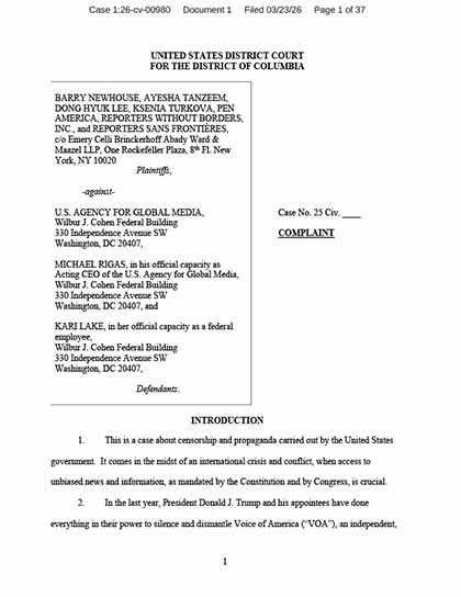 March 23, 2026 • Filed almost exactly one year after the first lawsuit, Newhouse v. USAGM accuses the administration of using VOA to broadcast propaganda. The plaintiffs say USAGM management, in particular Kari Lake, have suppressed coverage of events they did not want reported and turned VOA into a partisan mouthpiece of the administration, including requiring that it publish White House talking points nearly word-for-word.