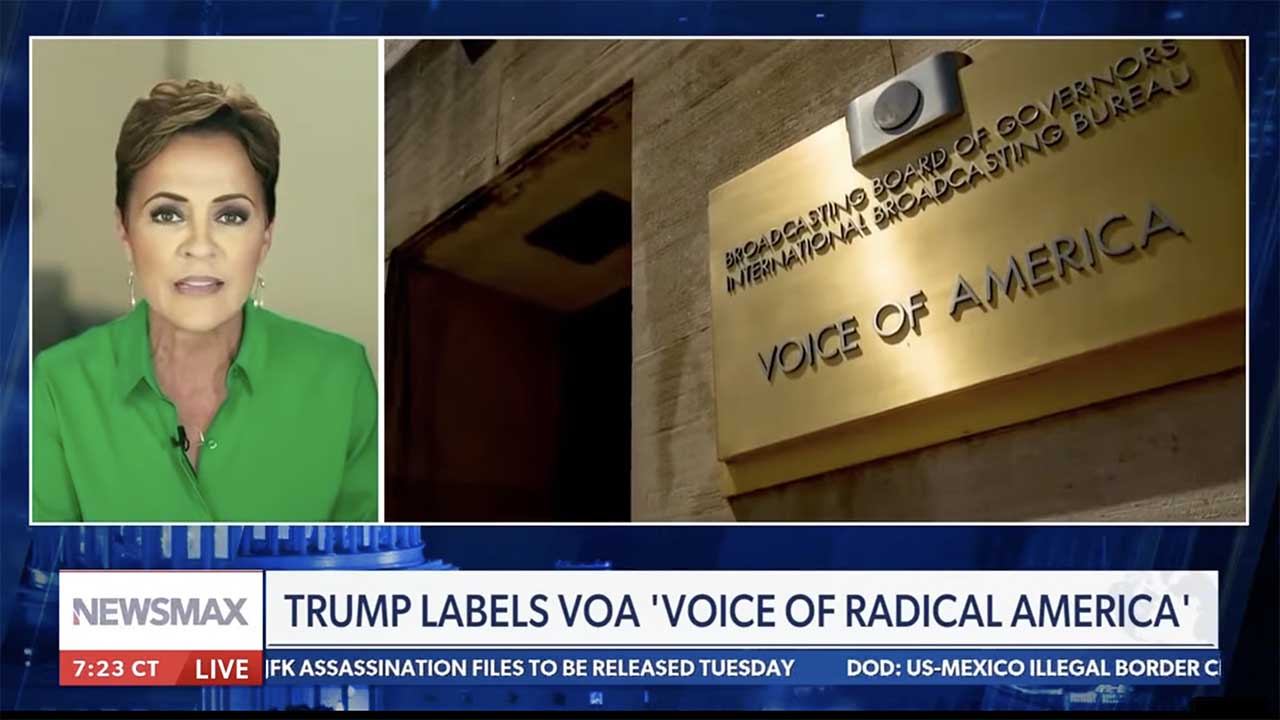 Kari Lake tells Newsmax that “the particular problem” with VOA “is it’s taxpayer funded and there’s no oversight over the editorial side of what’s going out over the air. The agency has tried to put up a … border wall around it that says … you can’t tell us what we say on the airwaves.”