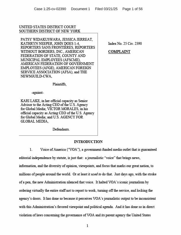 March 21, 2025 • Filed one week after President Donald Trump signed his March 14, 2025, executive order that began dismantling VOA, Widakuswara v. Lake has led to major court victories for the plaintiffs. Following the first hearing of the case at the U.S. District Court for the Southern District of New York, Judge Paul Oetken granted a temporary restraining order order that prohibited USAGM from immediately carrying out its planned layoffs, including for about 600 contractors.